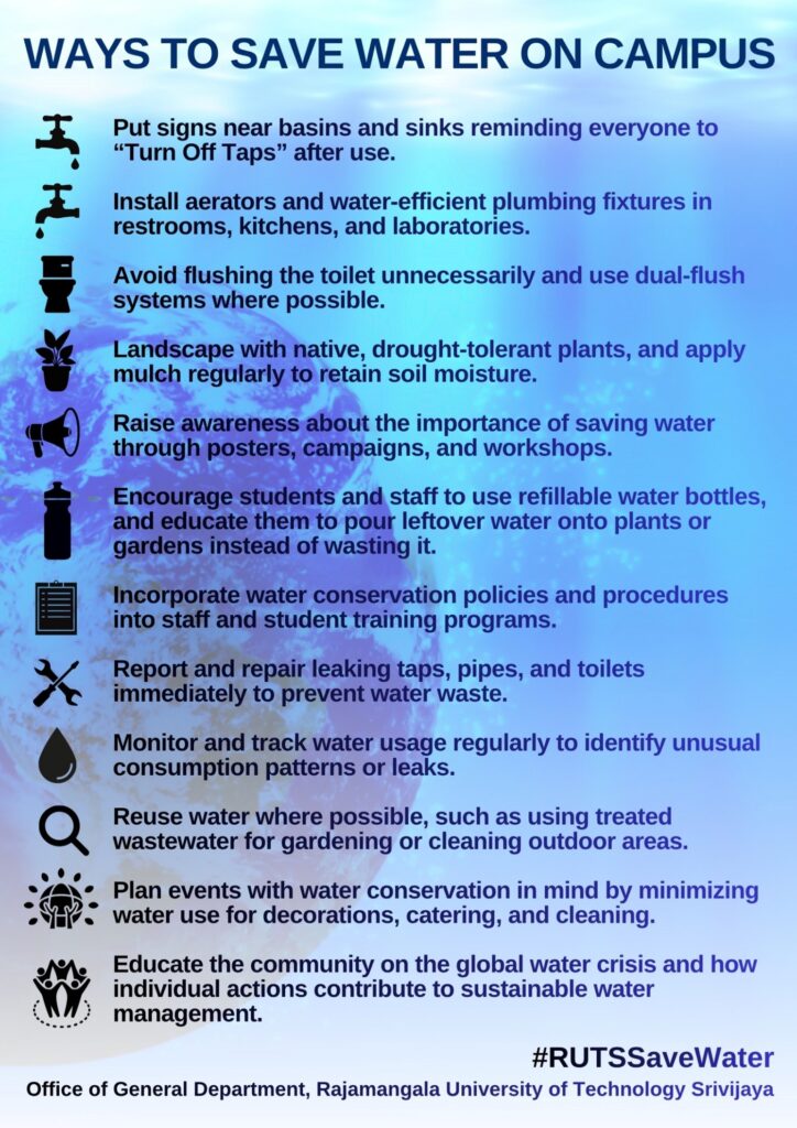 Rajamangala University of Technology Srivijaya (RUTS) recognizes the importance of promoting responsible and efficient water usage as part of its commitment to sustainability. With thousands of students, staff, and visitors using shared facilities daily, the university has implemented multiple strategies to encourage water-conscious behavior and reduce overall water consumption across all campuses.