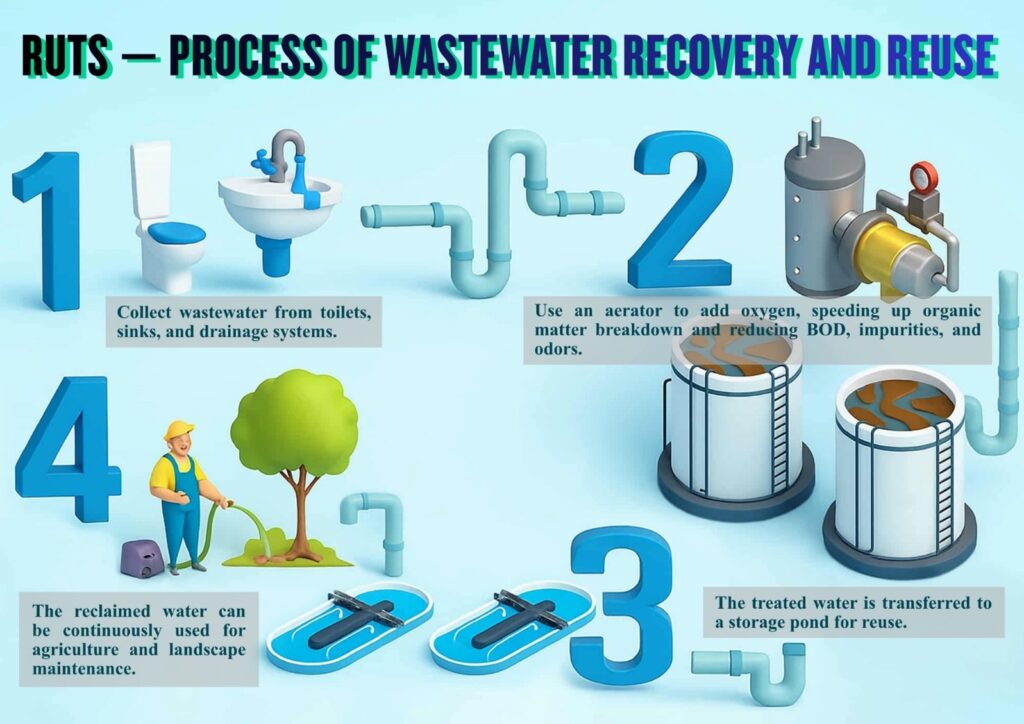 The wastewater recycling process at RUTS involves several treatment stages to ensure that the reused water is safe and suitable for its intended purposes. Wastewater is collected from various on-campus sources, including restrooms, cafeterias, laboratories, and in some cases, rainwater or greywater from sinks. The process begins with screening, where large particles such as debris, leaves, and solids are removed. The wastewater then enters sedimentation tanks, where heavier particles settle as sludge, and lighter substances like oils and grease are skimmed from the surface. Following this, biological treatment takes place—bacteria and microorganisms are introduced to decompose organic matter, while air or oxygen is pumped in to stimulate microbial activity, accelerating the breakdown of pollutants. This process effectively reduces the Biochemical Oxygen Demand (BOD), improving water clarity and odor. Finally, the treated water is transferred to holding ponds, where it is stored for reuse in campus agriculture and landscape maintenance.