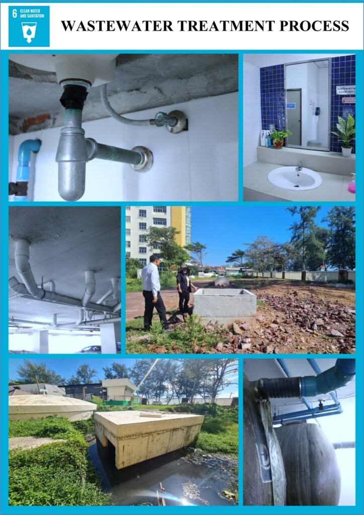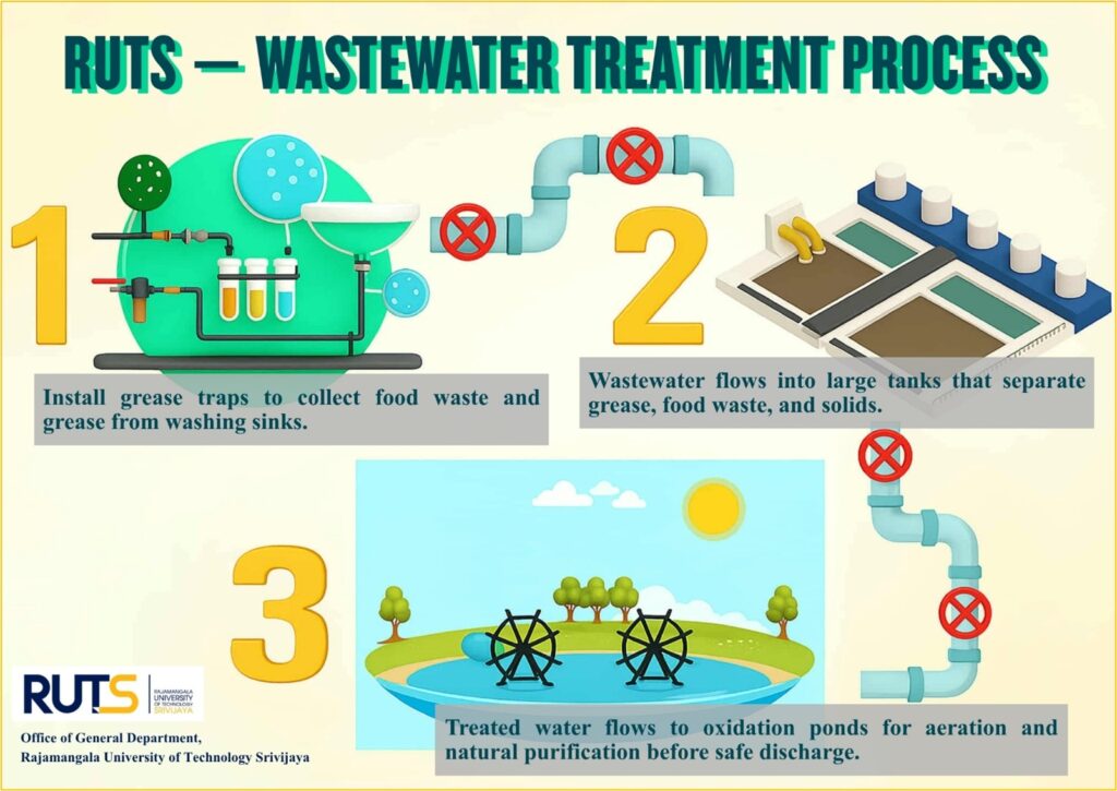 Rajamangala University of Technology Srivijaya (RUTS) has established a clear policy in compliance with the regulations of the Ministry of Natural Resources and Environment (B.E. 2548) to effectively manage, reduce, and separate wastewater generated from university buildings and canteens. To support this policy, the university has implemented a comprehensive on-site wastewater treatment system that combines both engineering solutions and biological methods to ensure sustainable and environmentally responsible water management.